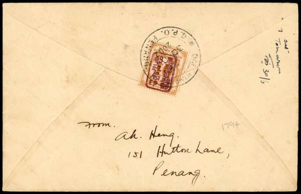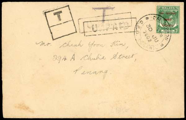 1942 local envelope with Straits 3c DAI NIPPON 2602 with Penang CDS 30 JU 2602, handstamped boxed ‘T’ and boxed UNPAID. On reverse MPU 10c yellow-orange with Chop H in brown with Penang CDs of the same date. Fine, with BPA Certificate (2003). SG JD 25b