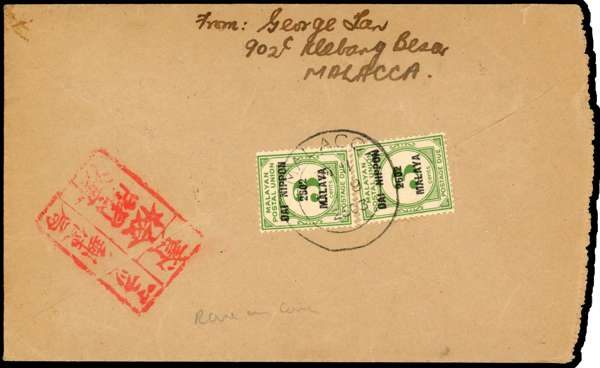 Postage Dues. 1943 envelope used locally in Malacca bearing Selangor 2c on 5c, 6.8.2603 CDS. Evidently the sender did not take account of the surcharge. ‘T Malacca’ in circle on front, and two examples of the MPU 3c DAI NIPPON 2602 MALAYA affixed to the reverse with Malacca CDS of the same date. Red censor chop on reverse. Envelope reduced at right, otherwise fine, a rare cover. SG JD29