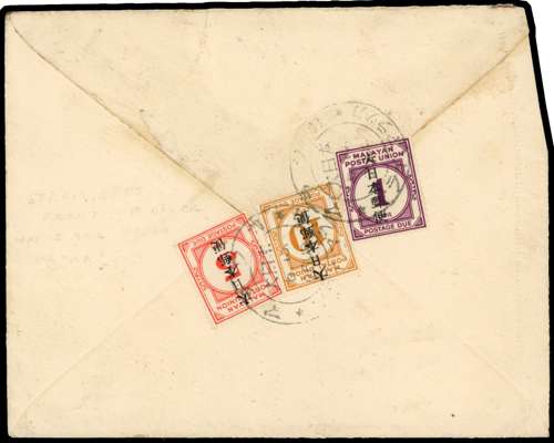 Postage Dues. 1945 envelope from Kuala Lumpur to Malacca, franked with a pair of Kedah 6c with square Revenue chops. Uncancelled, the front with KL datestamp of 11.6 (Proud JD4) and ‘T’ in triangle (Proud UP6). On reverse, MPU 1c, 5c and 10c Dues with Type 2 overprint, Malacca datestamps of 13.6 (Proud JD3). Envelope a little truncated at left, still a fine cover. SG JD34, 37, 39