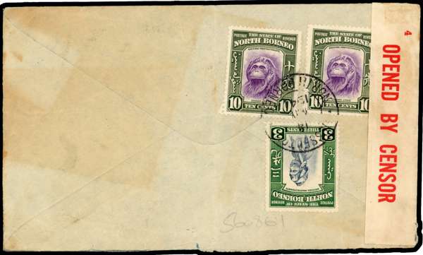 Postal History. 1941 envelope to Australia bearing 4c, 8c, 25c and 2c War Tax, Jesselton CDSs of 13 MAR. with 3c and 2 x 10c on reverse. Violet triangular Censor 4. Central fold and minor staining, the War Tax stamp very scarce on cover. SG 319