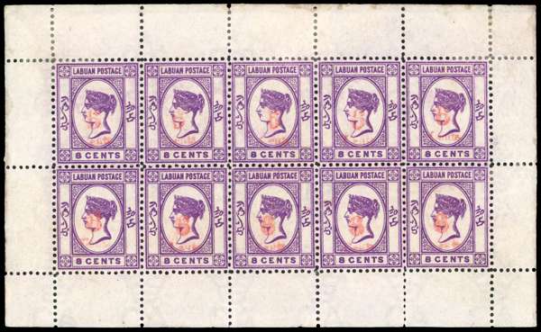 1891-92 6c on 8c mauve, type 10 surcharge in RED, the UNIQUE COMPLETE SHEET OF 10 (5x2), including the variety 'No dot at lower left' on pos. 10, o.g. (six stamps unmounted). A spectacular and beautiful item, ex Ferrary (sale VI, 25/4/23, lot 309) and Hind (Harmer 28/5/34, lot 416), with RPS cert No. 17,787 (not present). SG 36,36b £16,500+