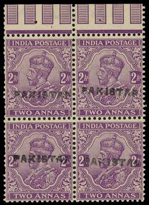1948 handstamps on India. 1911 2a watermark Single Star booklet pane of four with Peshawar metal handstamps in black, lightly toned unmounted o.g., few rough perfs at left otherwise fine. D&I H297b