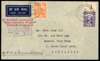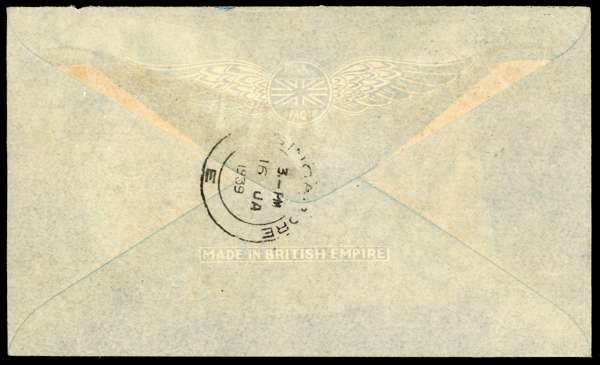 Postal History. 1939 registered airmail envelope to Singapore with 5c and 15c, Kuching CDSs of 16 JAN. Typed legend ‘By Wearnes Aeroplane “Experimental Flight” Sarawak- Singapore’, and manuscript 'By R.M.A. “Governor Ibbotson”. Singapore arrival of the same date on reverse