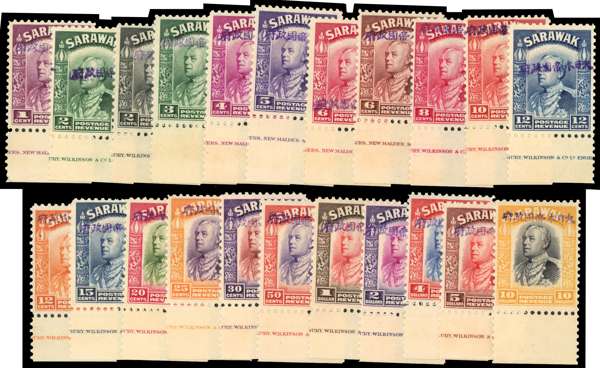 1942 violet opt, part set to $10, 22 values, (lacking only the 3c black, 8c red-brown, 15c orange and $3) all lower marginal and all but the $4 and $10 with part imprint (mostly matching), unmounted o.g. A few values with trivial gum toning as often, but mostly very fine to superb. (The 2c green and 12c blue have the opt across the portrait, the 6c carmine opt at foot, the other values opt at top, as usual.). A magnificent series, extremely scarce in this form and quality. SG