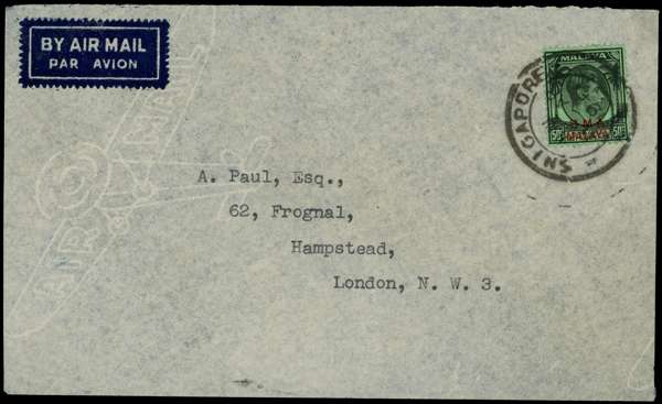 1947 envelope to London bearing BMA 50c cancelled by clear SNIGAPORE error CDS of 11 AP. Rare