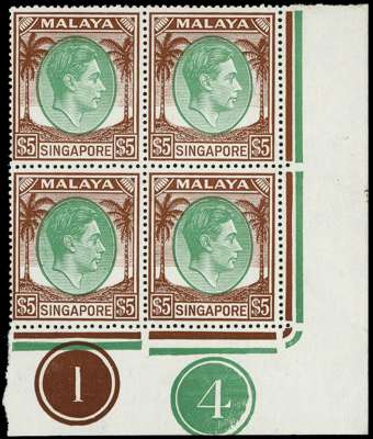 1952 $5 green and brown lower right corner block of four with Plate 1-4, unmounted o.g. SG 30, £900