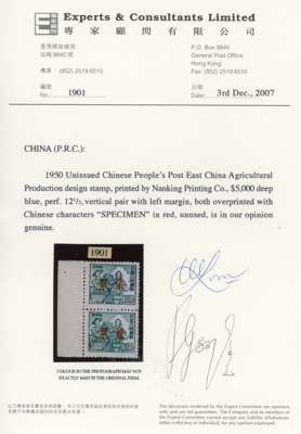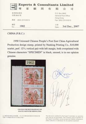 East China: 1950 'Harvesters and Ox' $5000 indigo and $10,000 scarlet in left marginal vertical pairs, each overprinted specimen in Chinese, these stamps were prepared for use but never issued, although the $10,000 was subsequently surcharged $20,000 and issued as a unified PRC stamp in May 1950 (SG 1431), each with 2007 Experts & Consultants cert, most unusual.