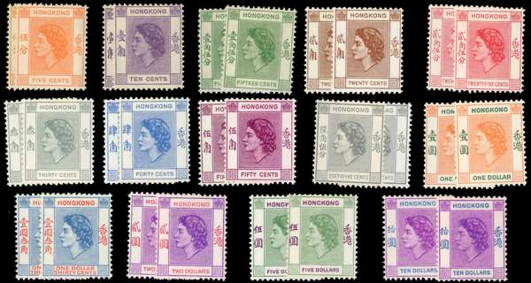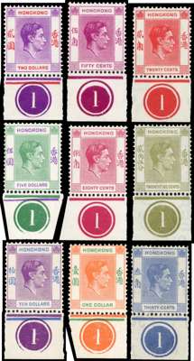 KGV-QEII mint collection including: KGVI 1938-52 later printings set to $10 all lower marginal with all less 4c orange showing plate numbers, 1954-62 set to $10 with shades, on $5 & $10, Hong Kong PO's in China 1917-21 set to $10, and New Colours set to $2, mixed condition in places, mostly fine appearance.