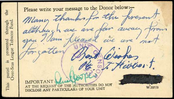 1944 Cigarette postcard addressed to Chicago USA, franked by 1940 1½a dull violet (litho), tied by cds for 15 NOV, with triangular censor mark in mauve and octagonal C-8 mark, reverse bearing Censor D 193 d/s in violet, minor surface stain and bend, otherwise fine, attractive and scarce. SG 269b
