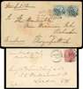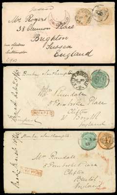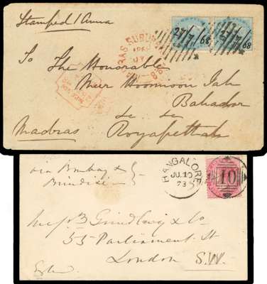 1824-1873 group of eight covers including: 1824 pre stamp entire letter from Bangalore to London, endorsed ‘Post Paid’ ‘As 9’ and rated ‘2/6', reverse with bearing numerous marks with Post Paid Bangalore oval, superb strike from Out Station Madras Ship Letter d/s for OC 12, with further Madras despatch and India Letter Plymouth boxed h/s, 1855 entire to Calcutta franked by 1a red Die I, with similar entire addressed to Bombay franked by 1a dull red Die II, both cut to shape, 1863 cover to Brighton franked by 2a yellow-buff (2), 1867 & 1869 pair of covers from the same correspondence, addressed to Bristol, 1868 local cover franked by ½a pale blue vertical pair from Madras to Fort Poyapettah, and 1873 cover to London franked by 8a rose Die II, tied by Bangalore 10 type 9 duplex, fair to fine condition, attractive items.