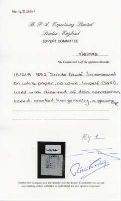 1852 Scinde Dawk ½a white cut square, with good to large margins, used cancelled by diamond of dots mark, cracked horizontally and a trifle toned, still an attractive example of this classic Indian rarity. BPA Certificate (1995) SG S1 £3000