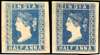 1854 ½a blue Die I, pos. 45, and ½a deep blue pos. 68, (both from ‘A’ stone) four good to large margins, unused without gum as issued, faintly toned pos. 45 with minor crease, still fine examples. SG 2 & 4 £625