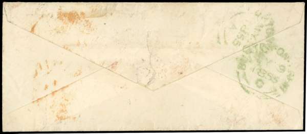 1855 envelope to Burton on Trent, endorsed 'Via Southampton' franked by 4a blue and red, 2nd printing (Head Die II, Frame Die I) both cut to shape, tied by diamond of dots, with London tombstone arrival in red, India Paid crescent and Madras G.P.O despatch mark, backstamped by Burton on Trent arrival d/s's in green, envelope flap creased and stain to front, still attractive. SG 19