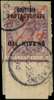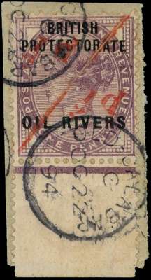 1893 ½d on half of 1d lilac severed pair, the right half bottom marginal, used on piece with two Old Calabar CDSs of OC 22 94, fine. SG 7, £280