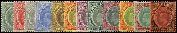 1907-11 New colours set of 12 to £1, large part o.g. Odd minor blemishes (6d tone specks on gum, 5s short perf), still an attractive set with very fresh colours.