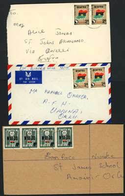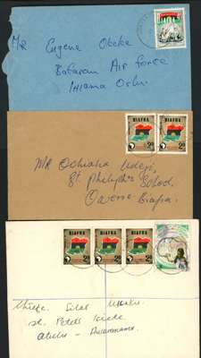 BIAFRA: collection with six local commercial covers with various frankings and usages, 1968 with 4d cancelled by UGBELLE cds to a member of the Biafran Air Force (roughly opened at right). 1969 with 2s6d 2nd Anniversary of Independence and three 2d issues tied by ABU cds etc. Also includes five mint sheets of the 1968 issues, some stuck to glassine backing sheets, condition varies