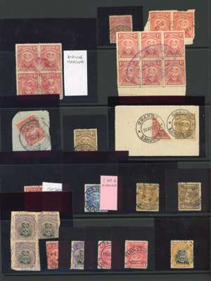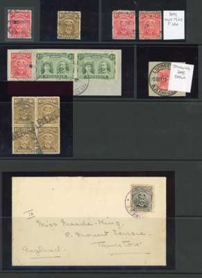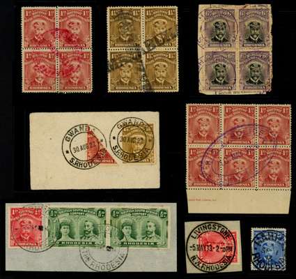 Postmarks. A highly specialised collection covering almost all of the known cancellations from Southern and Northern Rhodesia as found on the 1913-24 “Admiral” issue. The main portion of the collection is neatly presented in three large stockbooks and arranged alphabetically A-Z. Generally selected for clarity of strike and covering all offices from the most common, Salisbury, to the rare and seldom encountered, with much emphasis on illustrating the various types of postmarks used at each office along with errors of lettering, dropped spacer bars, ink types and colours.