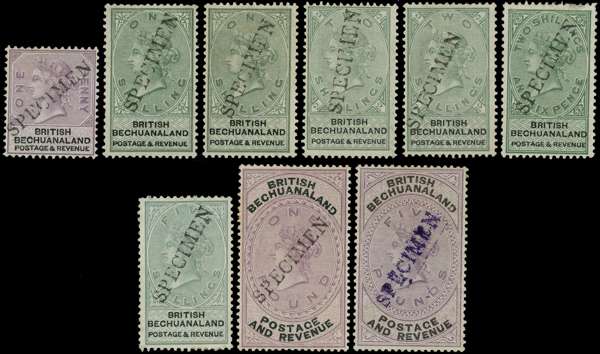 1888 Unappropriated Dies values handstamped SPECIMEN (Holmes Type 2, Samuel Type BEC2) mostly large part o.g.; 1d (without gum), 1/- and 2/- x 2 each, 2/6d, 5/-, £1 and £5. SG 10s, 15s-18s, 20s-21s