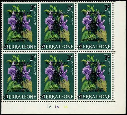 1965 (19 May) 3c on 3d Beniseed, ERROR PORTRAIT & '3c' DOUBLE, ONE INVERTED, lower right corner block of 6 (3x2) with plate numbers '1A', unmounted o.g. Almost certainly a unique positional multiple. SG 367b