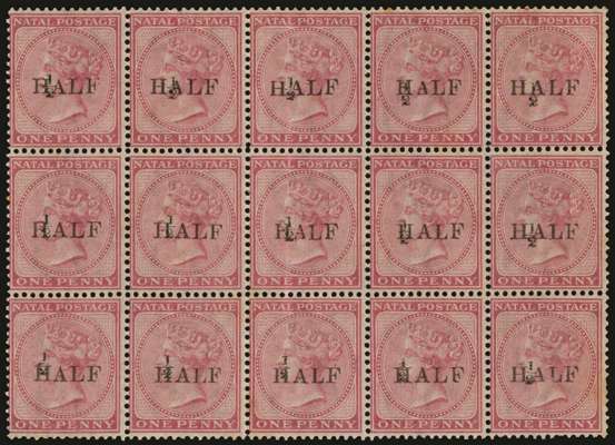 NATAL SG 86/9 1877 (13 Feb) ½d on 1d rose, surch as T19, block of 15 (5x3) with fractions "b" to "e" se-tenant, o.g.