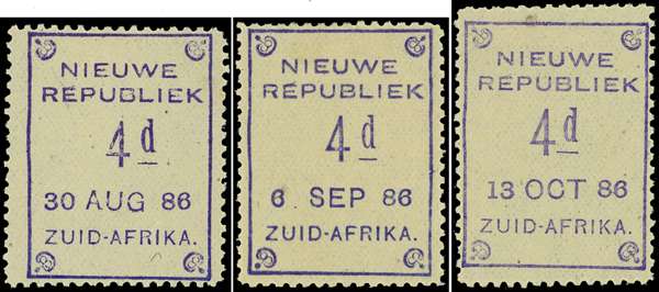 1886-87 4d violet on yellow, the 'set' of three dates, respectively '30 AUG 86', '6 SEP 86' and '13 OCT 86', large part o.g. Trivial blemishes as almost always, still a fine and very scarce trio with only 17, 19 and 15 examples of each recorded by Jonkers.