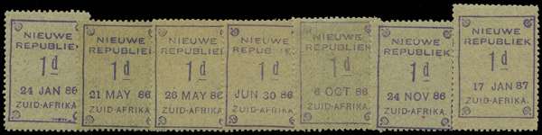 NEW REPUBLIC SG 26 1886-87 1d VIOLET ON BLUE x7 DIFFERENT DATES LPOG