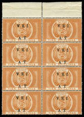 Telegraph. 1900 10s orange, type T15 opt, upper marginal block of 8 (2x4) from R1-4/2-3 of the setting, showing variety "Thick V" on three stamps in left column (R1/2, 3/2 and 4/2), brilliant unmounted o.g. R4/2 with slight crease (not apparent)