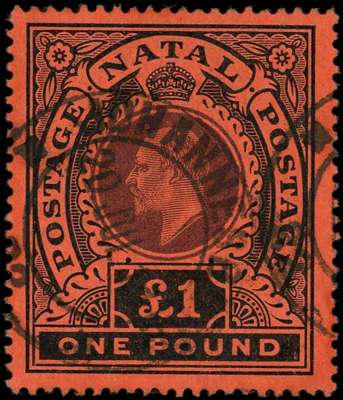Interprovincial usage. 1908-8 Natal £1 purple and black on red paper with nearly complete Johannesburg CDS of 20 JUL 11, fine and a rarity. SG Z100, £900