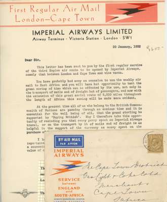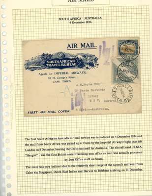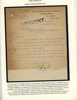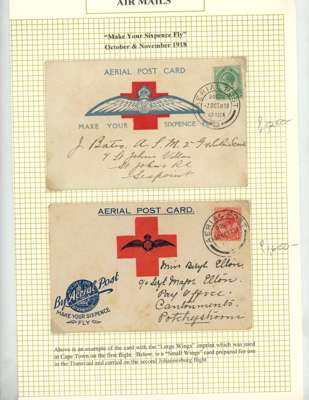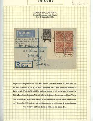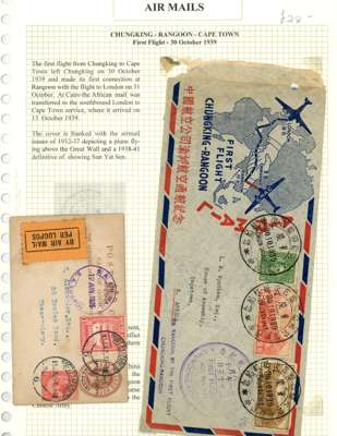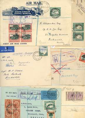 POSTAL HISTORY: Flight cover collection, with 1929 registered flight cover from Grenada to Pretoria rated 18d, pair of 1918 Red Cross Aerial Post Cards with additional letter authorising the transfer of the aeroplane to Pretoria for the Red Cross Fete, 1939 Chunking to Rangoon First Flight and onward to South Africa, 1932 Imperial Airways, England to South Africa with letter, etc., mixed condition, good lot for the specialist, (20 covers)
