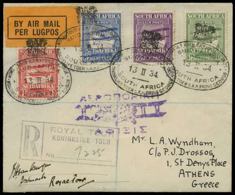 1934 (13 Feb) 'Wyndham' registered airmail cover (embossed Union of South Africa coat of arms on flap) from Cape Town to Athens, franked by 1925 Air set of 4 to 9d, tied by individual fine to very fine strikes of the special 'ROYAL TOUR H.R.H. PRINCE GEORGE / SOUTH AFRICA' bilingual oval ds used by the Post Office attached to the Royal Tour Train, with black/orange airmail label at upper left (tied) and boxed 'ROYAL TOUR / KONINKLIKE TOER' registration H/S in violet at lower left. Backstamped at Cape Town (13 FEB) and Athens (21.11.34). The face with Greek airmail cachet in violet and SIGNED at lower left by by the postmaster on the Royal Train, J.P. van Aswegen. Trivial edge blemishes, still very fine and rare.