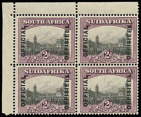 Official. 1928-30 "Set 5" (= 1930 issue) 2d "grey-black and dull purple" recess, SG type O1 opt (19mm space, without stops), Perf 14x13½ "up", upper left corner block of four, fresh unmounted o.g. Insignificant corner gum bend mentioned for accuracy, still very fine, and a very scarce positional multiple in this condition. Ex Matheson. [Union Handbook O18]