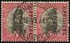 Official. 1930-47 "Set 6" (= 1931 issue) 1d "grey-black and carmine-rose" roto, SUIDAFRIKA one word, wmk inverted, SG type O2 opt (12½mm space), horizontal pair showing spectacular MISPLACED OPT (sideways to left, leaving the two words close together and transposed at right), neatly cancelled by central Johannesburg cds dated "16 VI 47". Plated as R4/1-2 from sheet no.4071, the right stamp with diagnostic opt flaw (dot in "O" of OFFISIEEL, misplaced from R4/3 !). A rare pair. Ex Matheson. [Union Handbook O21 V9]