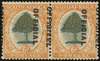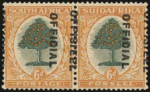 Official. 1930-47 "set 6" (= 1931 issue) 6d "dull green and pale orange" roto, SUIDAFRIKA one word, wmk inverted, SG type O2 opt (12½mm space), horizontal pair showing major leftward misplacement of opt so that "OFFISIEEL" falls on vertical perfs, fresh unmounted o.g. Light gum creasing does not affect very fine appearance, ex Matheson. [Union Handbook O23 V9]