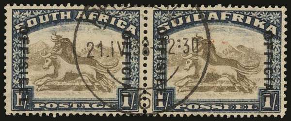 Official. 1930-47 "Set 11" (= 1935 issue) 1s "grey-brown and deep grey-blue" roto, SUIDAFRIKA one word, wmk inverted, SG type O2 opt (21mm space), horizontal pair showing "Twisted horn flaw" on left stamp (R1/5), attractively cancelled by large part Pretoria cds, dated "21 IV 38". Slight creasing (and trivial red marks on normal), still very fine appearance. Unpriced in this condition in Part I 2019. Ex Matheson. [Union Handbook O50 var]
