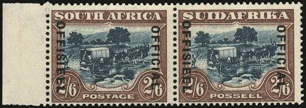 Official. 1930-45 2s6d green and brown, rotogravure printing, 'SUIDAFRIKA' one word, type O2 opt with lines 21mm apart, WMK INVERTED, left marginal horizontal pair, part to large part o.g. with exceptional colour. Very scarce. From the smallest reported printing of any 'Official' stamp, comprising just 25 upper panes of 60 (= 750 possible pairs).