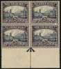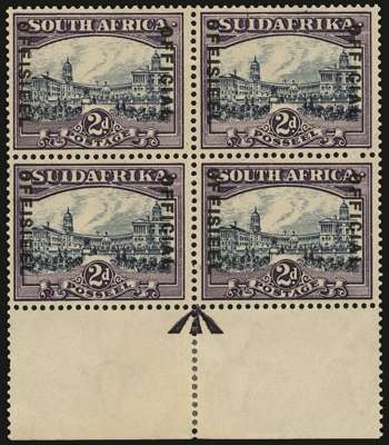Official. 1930-47 "Set 15" (= 1938 issue) 2d "indigo and violet" roto, SUIDAFRIKA one word, SG type O2 opt (21mm space), lower marginal block of four with arrow (R19-20/3-4), fine o.g. (lower pair unmounted, reinforcement in margin). An attractive and very scarce positional multiple. Ex Matheson. [Union Handbook O72]