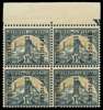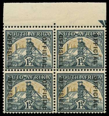 Official. 1937-44 'Set 20' (= 1944) 1½d reduced format, SG type O2 opt reading down WITH DIARESES (14½mm with 'OFFICIAL' at right), upper marginal block of 4 from R1-2/9-10 of the 10x12 setting WITH PART ARROW, unmounted o.g. (hinged in margin). Fractionally yellowish gum and and one short perf, but very rare and desirable in this positional form, with complete arrow only possible from the left margin (since only left half-sheets were overprinted). [Union Handbook O99]