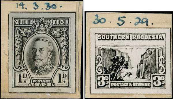 1931-37 1d “Field Marshall” and 3d “Small Falls”, photographic essays in close to issued designs, affixed to individual pieces from the BW daily record book, dated “30.5.29” (3d) and “14.3.30” (1d). A very fine and important pair, almost certainly unique.
