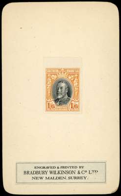 1931-37 “Field Marshall” 1s6d black and orange-yellow, imperforate colour trial affixed to Bradbury Wilkinson presentation card (63 x 104mm). Fine and rare. SG 24.