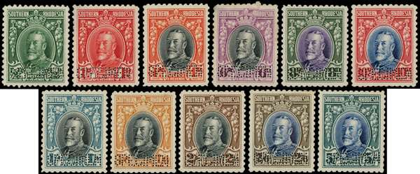 Specimens. 1931-37 “Field Marshall” ½d, 1d, 4d, 6d, 8d, 10d to 5s, eleven value perforated “SPECIMEN” (type B1), large part o.g. The 6d defective at top otherwise fine and fresh. Rare. Ex “Blanic”. SG 15/16, 19/27.