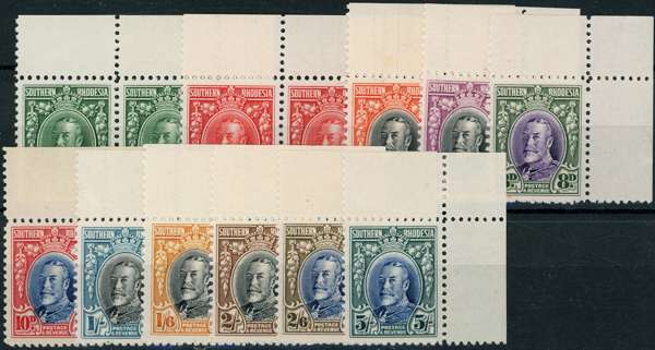 1931 “Field Marshall” original set of 11 to 5s, line perf 12, matching upper right corner marginal examples (½d and 1d as horizontal pairs), brilliant o.g. (stamps unmounted except 2s with small gum faults from careless handling). An exceptional set which would be virtually impossible to replicate today. SG 15/16, 19/21, 22/27.