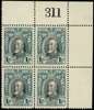 1931-37 “Field Marshall” 1s black and greenish blue, perf 14, upper right corner block of 4 with sheet number “311”, unmounted o.g. Minor bend still fine and rare in this positional form. SG 23b.