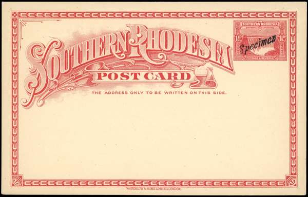 Postal Stationery. 1931 “Small Falls” 1½d rose-red post card, h/s “Specimen” (Samuel type R4). Archival punch hole at upper left, otherwise fine and very rare. Only two examples known. PFSA cert (2009).