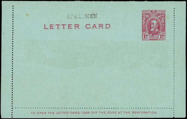 Postal Stationery. 1931 “Field Marshall” group comprising ½d wrapper, ½d envelope (230 x 104mm), 1d letter card, and 4d registered envelopes x2 (sizes G and H2), each with seriffed “SPECIMEN” h/s applied by the Bechuanaland postal authorities (type BEC2a). Slight imperfections but extremely rare. (5)