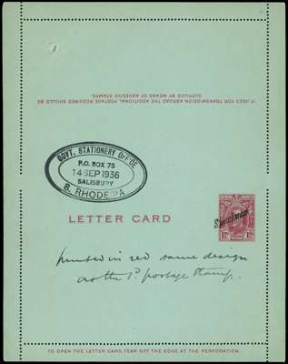Postal Stationery. 1931 “Field Marshall” 1d carmine/blue letter card, unfolded, with local “Specimen” h/s (Samuel type R4), m/s endorsement “Printed in red same design as the 1d postage stamp.” and black oval “GOVT. STATIONERY OFFICE / P.O. BOX 75 / 14 SEP 1936 / SALISBURY / S. RHODESIA” cachet above. Archival puncture at upper left, otherwise fine and very rare.
