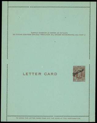 Postal Stationery. 1931 “Field Marshall” 1½d brown letter card, with local “Specimen” h/s (Samuel type R4), unfolded. A couple of edge blemishes and closed archival puncture at upper left, otherwise fresh and fine. Prepared for use but unissued, and a major Southern Rhodesia postal stationery rarity.