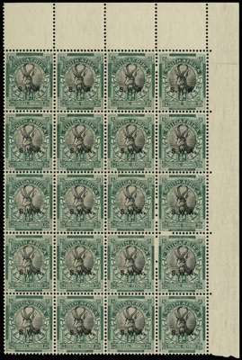 1931 rotogravure ½d black and green, top right corner block of ten pairs with (Issue 1 or 2) R1/12 'snail' on buck's breast (largely obscured) and R4/11 white patch in front of buck's breast (Union Handbook v8), unmounted o.g. R1/12 does not have the broken or retouched shading above the muzzle; R1/11 has the green dot at left, so an anomalous state. Lightly folded between rows 2 and 3