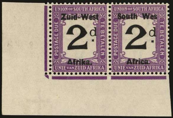 Postage Due. 1923 2d black and violet, De La Rue printing, setting I opt (14mm space, with hyphen), lower left corner horizontal pair, right stamp showing variety "Wes" for "West" (R10/2), fresh unmounted o.g.