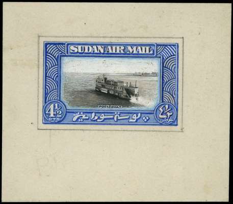 1950 Airmail 4½pi hand painted essay, with photographic centre, embellished with Chinese White and frames executed in ultramarine (issued colour) and Chinese White on thick glazed card, (58x50mm), very fine, a beautiful essay. SG 120var Ex De La Rue Archives