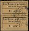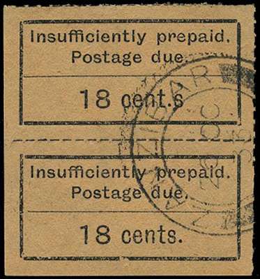 Postage Due. 1926-30 18c black/salmon, type D1, lower left corner vertical pair (with characteristic narrow margins for this colour), the upper stamp (R4/1) variety "cent.s", fine used with large part "26 OC 33" cds. Very scarce.